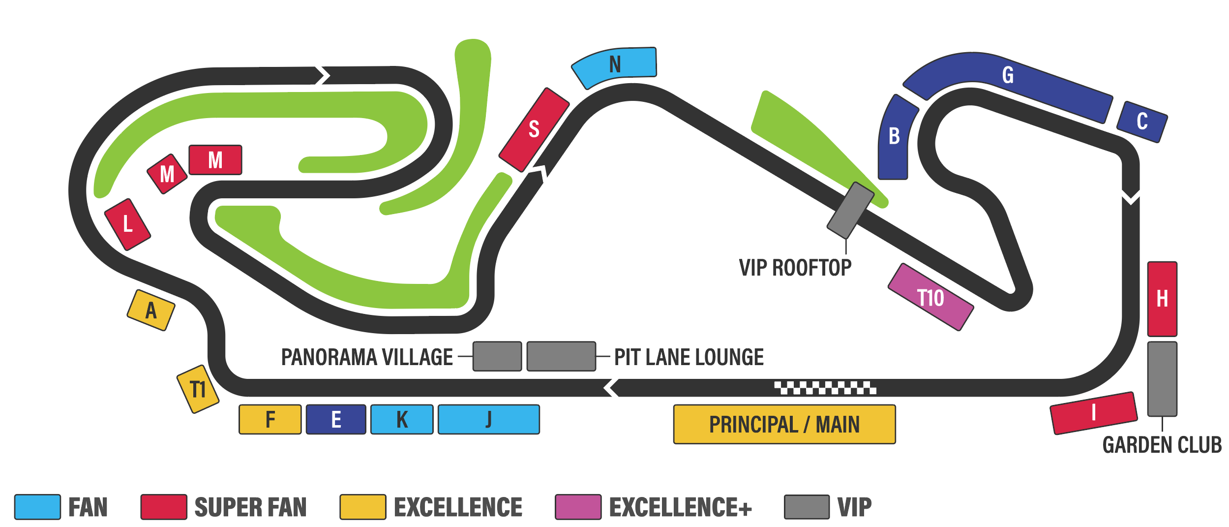 La tribune M est située à l'intérieur du circuit, près du virage n° 5. Depuis cette tribune, vous profiterez d'une vue imprenable sur les voitures qui passent du virage n° 4 au virage n° 6 en passant par le virage n° 5. Bien que cette section n'offre pas beaucoup de dépassements, elle permet de voir comment les pilotes gèrent leur rythme de course et le contrôle de leur voiture dans ces virages. Depuis les sièges supérieurs de cette tribune, vous pouvez également apercevoir les voitures dans le virage n° 1.